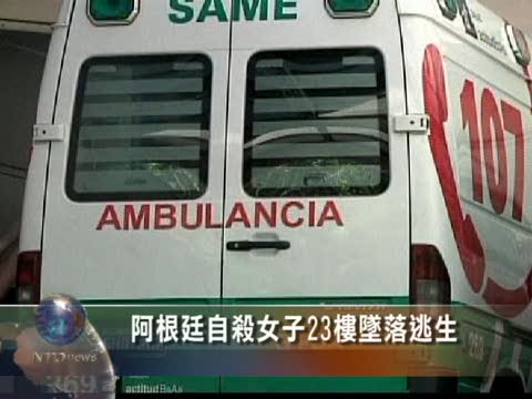 【新唐人2011年1月25日訊】1月24號(星期一),一名33歲的阿根廷女子,在布宜諾斯艾利斯的一家酒店,從23樓墜落,正好落在一輛經過的出租車上,僥倖逃生,被送往醫院急救。