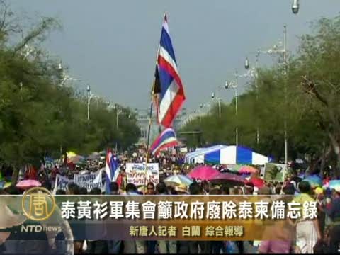 【新唐人2011年1月26日訊】泰國民間團體“人民民主聯盟”(民盟)的支持者“黃衫軍”,1月25日起在泰國總理府附近集會示威,要求當局廢除2000年泰國、柬埔寨簽署的處理兩國邊界糾紛的諒解備忘錄。