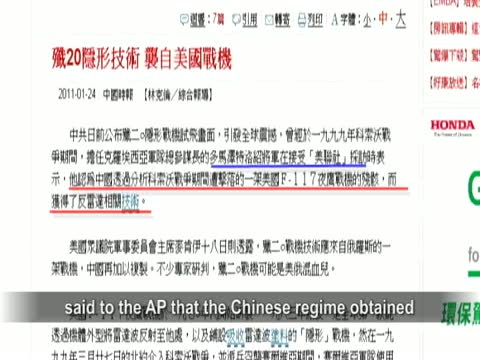 【新唐人2011年1月26日訊】中共早前公布「殲20」隱形戰機試飛畫面,最近有消息傳出,「殲20」的部分高科技可能來自一架美軍F-117夜鷹戰機,這架「夜鷹」1999年在塞爾維亞被擊落後,部分殘骸被中共取得。