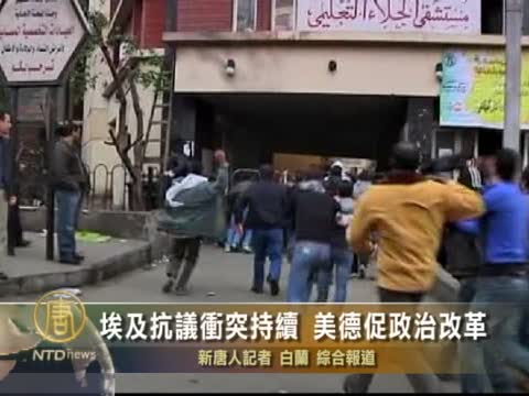 【新唐人2011年1月27日訊】受突尼斯茉莉花革命的鼓舞,埃及多個城市日前發生大規模民眾集會,要求總統穆巴拉克下臺,抗議者星期三與警察發生衝突。到目前為止,有3名抗議者和一名警察在衝突中喪生。有至少15人被抓。德國外長韋斯特維勒當天呼籲埃及政府尊重人民的權利,敦促雙方保持克制。