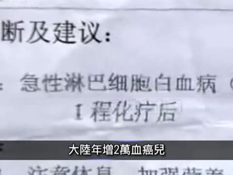 白血病已成為威脅中國兒童健康的「主要殺手」。大多數家庭因無力支付少則10萬多則40萬的巨額治療費用而放棄治療,患兒只有等待死亡。目前全國至少有400萬白血病(血癌)患者,每年新增約4萬名白血病患者,其中50%是兒童。