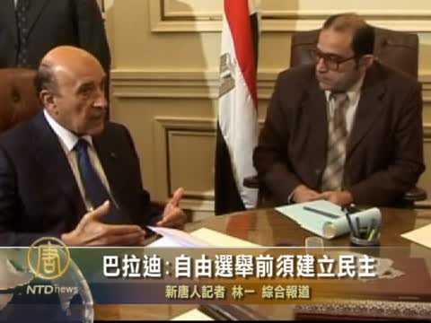 【新唐人2011年2月7日訊】埃及反對派領袖、諾貝爾和平獎得主巴拉迪(MOHAMED ELBARADEI),週日(2月6號)在接受美國電視臺採訪中,激烈抨擊當天政府與反對派的談判,並呼籲花一年時間建立民主,之後再舉行自由公正的選舉。