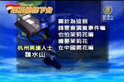【新唐人亞太台2011年2月12日訊】全球媒體都在關注埃及總統下台的消息,不過中共的官方媒體以及一些門戶網站則是低調報導。但還是有一些中國異議人士,在獲知消息之後,慶祝埃及強人專政的倒台,馬上來帶您看到我們的獨家消息,中國杭州異議人士,今天(12日)上午,為了慶祝埃及總統穆巴拉克下台,在杭州著名風景區吳山,拉橫幅慶祝,參與活動的中國民主黨成員魏水山和薛明凱,竟然因此被警方逮捕,扣押在杭州當地的派出所。我們的獨家報導。