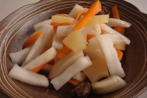 白蘿蔔1條、紅蘿蔔1/3條、罐頭鳳梨4片