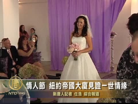 【新唐人2011年2月15日訊】2月14號(星期一),情人節,紐約的最高樓帝國大廈,見證了14對新婚夫妻的一世情緣。
