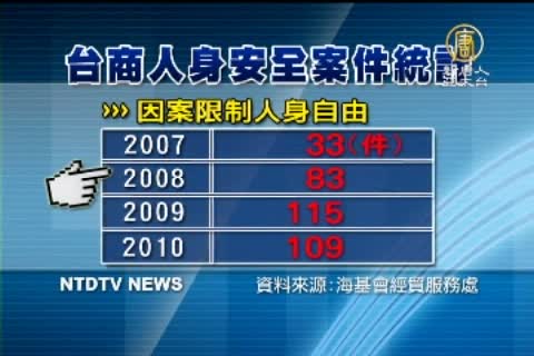 2008到2010這三年間,台商投訴財產法益糾紛的案件數共 1,017件,佔過去20年間案件總數的60.8% (資料來源:海基會經貿服務處);而在大陸因案被限制人身自由的台商人數從2007年的33人躍升至2008年的83人,之後兩年都突破百人。