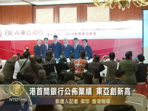 【新唐人2011年2月16日訊】香港最大獨立華資銀行,東亞銀行是今年香港首間公布業績的銀行。星期二公布全年盈利創歷史新高,按年增長六成二,屬市場預期的上限。