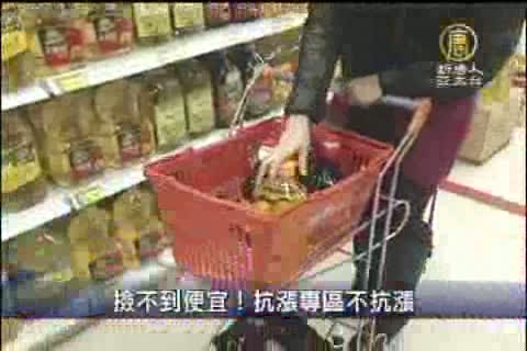 【新唐人亞太台2011年2月18日訊】對抗物價上漲,許多賣場推出了所謂的『抗漲專區』,不過你知道嗎,不見得放在專區裡的商品就是最便宜,像以葵花油來說,專區內一公升特價67元,但是放在一般架上的,最低可以到50元,如果消費者不仔細比價,不見得真的能撿到便宜。