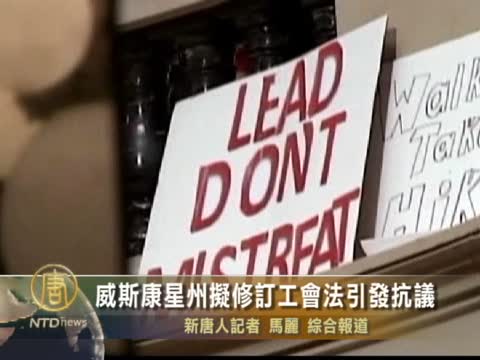 【新唐人2011年2月19日訊】美國威斯康星州數千名政府公務員本週湧向麥迪遜的州議會大廈,抗議共和黨州長斯科特.沃克(Scott Walker)大大削減公務員福利、廢除他們談判權的提案。 警方說,抗議從週一就開始了,人數每天都在增長。