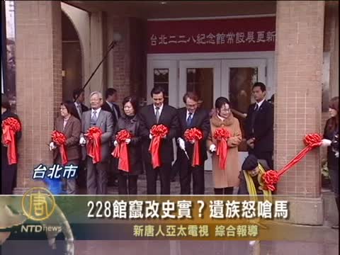 【新唐人2011年2月21日訊】經過10個月的翻修,228紀念館20號由總統馬英九和受難家屬代表,一起重新揭幕開放,不過整修過後的展館史料,將228定位為秩序恢復和平亂,這讓228家屬相當憤怒,當面向總統馬英九表示抗議。