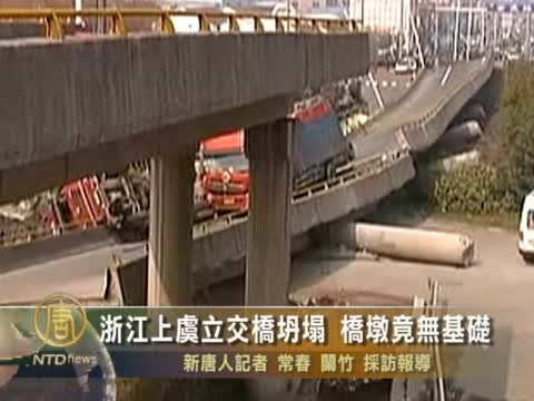 【新唐人2011年2月24日訊】中國浙江上虞市,近日發生一立交橋百米匝道整體坍塌事故,造成4輛大貨車發生翻覆,其中3人受傷;官方把矛頭指向貨車超載,但據專家分析,是橋墩偷工減料所致。