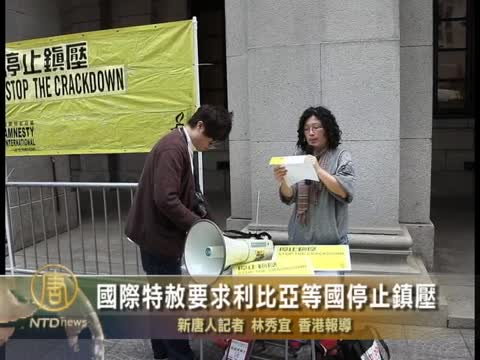 【新唐人2011年2月26日訊】中東局勢緊張,多國政府以暴力手段鎮壓群眾和平抗議活動,尤以利比亞及巴林政府為甚。國際特赦組織星期五在香港舉行抗議活動,要求這些國家立即停止鎮壓,並呼籲市民透過互聯網支持當地民眾的抗議活動。