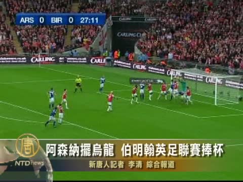 【新唐人2011年2月28日訊】星期天在英格蘭足球聯賽杯決賽、阿森納對伯明翰的比賽下半場結束前上演戲劇性一幕,比賽進行到第89分鐘時,阿森納後衛和門將在自家禁區配合嚴重失誤,伯明翰前鋒奧巴費米-馬丁斯(Obafemi Martins)撿漏輕鬆破網,2-1的比分讓伯明翰隊48年後又將聯賽獎盃捧回了家。