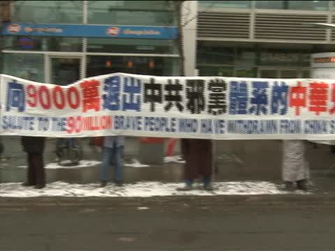 幾十名退黨服務中心的義工,沿著士巴丹拿大道一字擺開各種勸三退的標語,同時也向過往的行人發勸退黨的資料。有人當場以真名退出共青團和少先隊。民眾表示退黨是大勢所趨,人心所向。