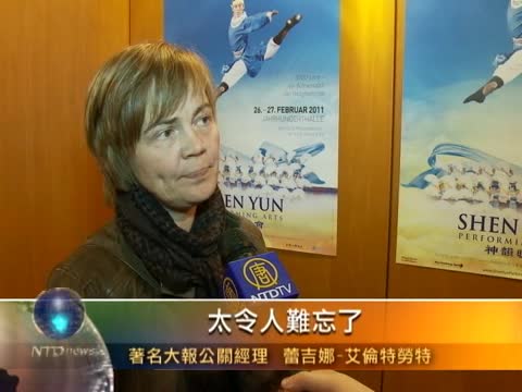 【新唐人2011年3月2日訊】美國神韻巡迴藝術團,在歐洲第一站德國金融重鎮法蘭克福的三場演出,吸引了各界精英與名流前來觀看。全場觀眾沉浸在神韻巨大的祥和能量場裡,為能欣賞到完美的頂級藝術而喜悅,全新的、極富創造力的節目令觀眾意外驚喜,回味無窮。