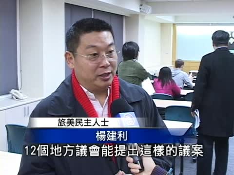旅美民主人士 楊建利:「12個地方議會能提出這樣的議案,我覺得非常重要」,「中共人權迫害記錄的範圍,世界範圍內都應該給一個制裁,給他一種威懾,就是說這樣的行為,是不能被文明社會接受,所以我想台灣在這方面為對岸做了非常好的例子,堅持這樣的原則,對台灣是非常有利的。我們可以想像,一個民主的中國,對於周邊國家,尤其是對台灣,它的意義多麼大,這種威脅,會逐漸放棄。」