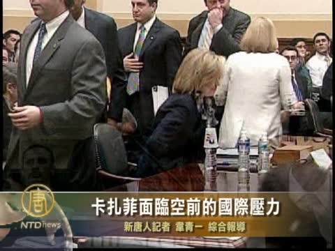 【新唐人2011年3月2日訊】卡扎菲在鎮壓反對派力量後面臨的國際壓力日益加大。美國,歐洲國家紛紛採取行動,或凍結卡扎菲家族資產,或考慮設置禁飛區,並商討採取軍事行動制止卡扎菲的血腥鎮壓。