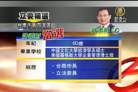 【新唐人亞太台2011年3月5日訊】民進黨成功拿下台南市和高雄市兩席立委,那麼由於民進黨黨主席蔡英文,在選前喊出「2席全勝,重返執政」的口號,將這場立委補選定調為2012總統大選的前哨戰,因此,在立院版圖的拓展,給了民進黨在提昇士氣上,一個關鍵性的力量。好,那麼帶您分別來看到,這次取得兩席立委席次的新科立委。首先來看到,台南市第四選區的許添財,以 49,002票領先對手,許添財,民國40年1月23日出生,台灣台南人,中國文化大學經濟學系碩士、學士,擔任過台南市市長以及立法委員。好,接著來看到高雄市的部份,同樣是由民進黨籍的林岱樺拿下,民國6