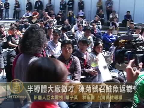 【新唐人2011年3月6日訊】半導體封測大廠5號上午在高雄真愛碼頭擴大徵才,預計召募一千名員工。高雄市長陳菊也出席活動現場,期盼年輕朋友鮭魚返鄉。