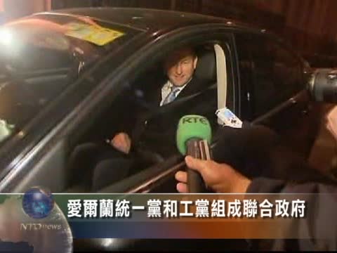【新唐人2011年3月7日訊】星期日愛爾蘭大選中獲勝的統一黨(Fine Gael)和得票第二的工黨宣佈組成新一屆的聯合政府。候任總理、統一黨領導人恩達和工黨領袖基爾摩爾分別講話讚揚合作,新政府的首要行動將是要求歐盟領導人降低此前對愛爾蘭金融紓困的貸款利率。