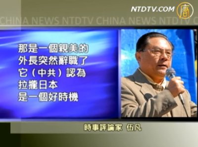 時事評論家伍凡:「這個世界的局勢變化,中東也好北非也好的鬧茉莉花革命,中共它現在覺得孤單,那麼在這個時候,石油價格與糧食價格急劇上升,美國經濟受到巨大壓力,在這個時候,日本外長那是一個親美的外長突然辭職了,它(中共)認為拉攏日本是一個好時機。」