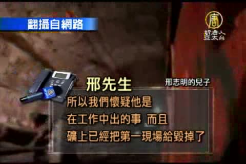 【新唐人亞太台2011年3月8日訊】來關心中國新聞真相報導。中國河南省平頂山郟縣東升煤礦職工邢志明今年元月份死亡,礦方宣稱的是在宿舍腦溢血死亡,但家屬認為礦方瞞報煤礦事故,因為邢志明的屍體有很多煤還有泥,明顯是發生礦難。