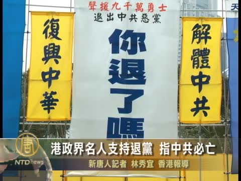【新唐人2011年3月9日訊】中國大陸退出中共黨團隊人數最近突破9千萬,多位香港政界人士在日前的退黨集會上稱讚退黨大潮邁向新的局勢,並指中共與民為敵將自取滅亡。