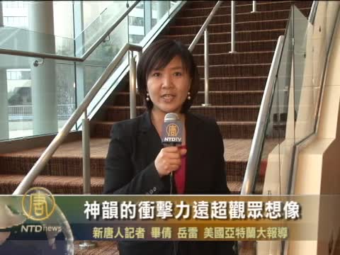 【新唐人2011年3月9日訊】神韻藝術團五度蒞臨美國喬治亞州亞特蘭大(Atlanta),再度於亞城世界級的表演場地“柯布能源表演藝術中心”(Cobb Energy Performing Arts Centre)展開為期三天的三場神韻晚會。觀眾表示,神韻的衝擊力遠超想像。