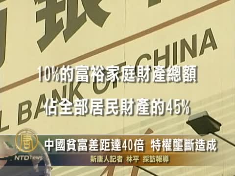 【新唐人2011年3月10日訊】根據最新調研報告,2009年中國富裕家庭與貧困家庭的收入相差達40倍,近年還以每年1.5%的速度不斷擴大,少數富裕家庭掌握了40%的居民財產,城鎮的貧富差距其實比農村還要嚴重。北京之春主編胡平認為造成中國貧富差距懸殊的主因是背後的權貴集團壟斷造成的