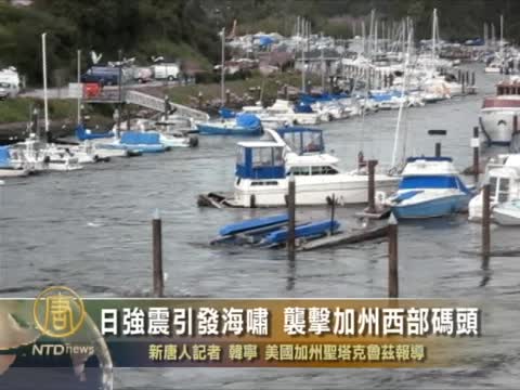 【新唐人2011年3月12日訊】美國西部時間3月11日(五)上午8點多,日本強震引起的海嘯抵達美國加州西海岸,造成一名男子死亡。新月市(Crescent City)和聖塔克魯茲(Santa Cruz)的海港,多艘船只損壞。請看詳細報導。