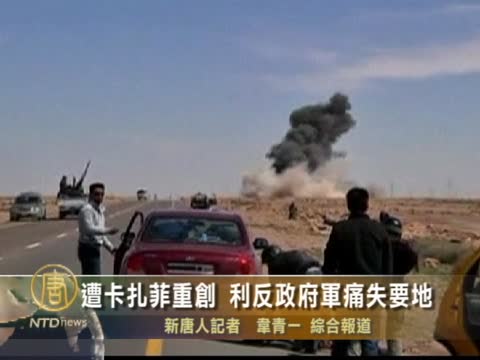 【新唐人2011年3月13日訊】利比亞政府軍週六猛烈襲擊了該國西部和東部反對派力量的一些目標,重要油港拉斯拉努夫和戰略城鎮本焦瓦德從反政府軍手裡相繼失守。