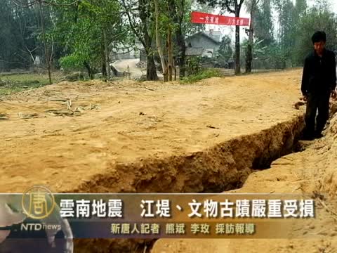 【新唐人2011年3月15日訊】3月10日發生在雲南盈江的5.8級地震,造成當地人員傷亡和經濟損失慘重,穿城而過的大盈江江堤被震裂,裂縫多達160餘處,多處文物古蹟和人文景觀嚴重受損,具有歷史價值的重要的佛教聖地--允燕塔已成危塔。