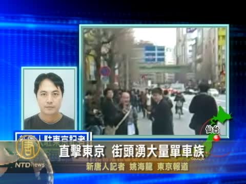 【新唐人2011年3月15日訊】福島核電事故影響260公里外的東京。14日是大地震以來第一個上班日,由於核電事故造成東京供電不足,分區輪流停電,交通運輸還不是很便利,東京街頭出現了大量騎自行車的上班族,上班和上學的人,也提早回家。我們在稍早前,與我們在東京的記者,姚海龍連線,請他來告訴我們目前東京的最新情況。