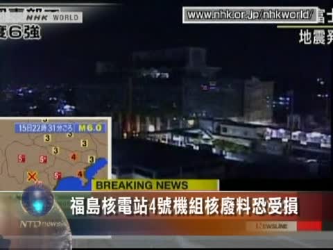 【新唐人2011年3月16日訊】東京電力公司週二晚表示,無法向福島第一核電站出現火災的4號機組的核廢料池注水,也沒能掌握水溫和水位。