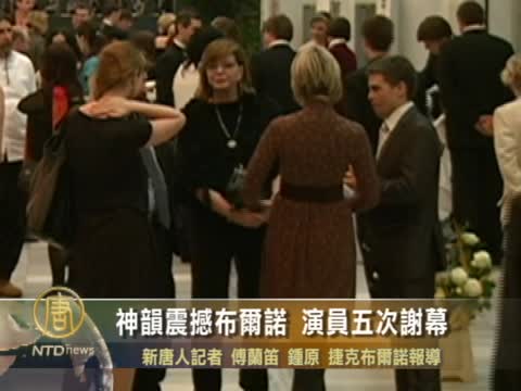 【新唐人2011年3月16日訊】3月16日晚,神韻巡迴藝術團在捷克布爾諾的最後一場演出完美落幕。晚會結束時,觀眾全體起立,持久而熱烈的掌聲和歡呼聲將大幕五次催開,直到劇院不再打開大幕時,才依依不捨的離去。神韻晚會不僅展示了壯麗而神奇的中國傳統文化,其純淨的內涵也為許多觀眾帶來心靈的撫慰。