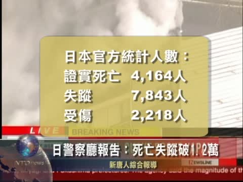 【新唐人2011年3月16日訊】日本警察廳在當地時間星期三晚6點,發表了最新聲明,在上週五的強震和海嘯雙重災難襲擊後,官方統計的死亡或失蹤的總人數已經攀升至1萬2000人,其中4164人證實死亡,失蹤人數為7843人,另有2218人受傷。
