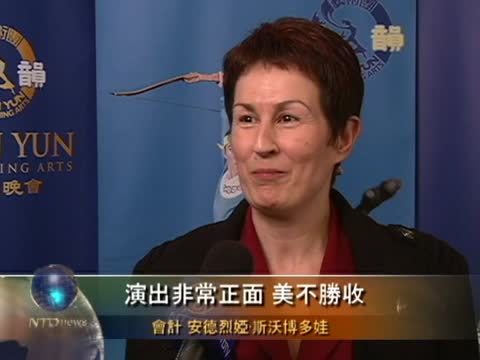 會計 安德烈婭•斯沃博多娃: "演出非常正面,美不勝收,我從沒有看到過這樣的演出,我願意把神韻介紹給所有人,讓人人都來看神韻。因為神韻不同尋常,不是一個普通的演出,非常特別...演出給我留下了美好的印象,美麗精緻的服裝,一切都美好優雅,令我魂牽夢縈,我會做夢再夢見神韻的。在當今匆忙而緊張的時代,神韻帶給人無比美好的感受,如同心靈的慰籍。"
