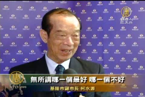 基隆市副市長 柯水源:「她(神韻)是無論從藝術文化的層面來講,舞蹈還有音樂,同時在表演的過程當中,還有很多很深很深的哲理,這個是我在觀看以,深深的感受到的。歌唱也好,舞蹈表演也好,都有她的特色,無所謂哪一個最好,哪一個不好,每一個都很好,每一個節目都非常精彩。」