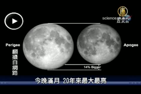 【新唐人亞太台2011年3月19日訊】日本311地震後,傳言不斷,像是有人說,台灣時間3月20日凌晨出現的超級月亮,會引發天災,科學家表示,這將是20年來,距離地球最近的一次,因此月亮不但比以往大百分之14,亮度也增加百分之30,不過, 科學家也駁斥了會引發災難的說法與傳言。