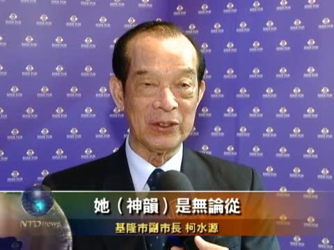 基隆市副市長柯水源:「世界一流的藝術團體的表演。我希望有更多的鄉親朋友有機會來欣賞難得一見的好的表演團體。我受益很多。目前我們這個社會,這個國家,很需要有一 種精神上的一些鼓舞,讓這個社會能夠更祥和,我們的國家能夠更繁榮。神韻藝術團的確有她,相當難得的一個,社會教育的價值在裡面,值得推廣。」