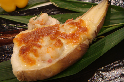 6.將炒好的麵糊,舀入挖空的竹筍內,撒上起士絲
