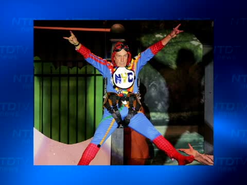 【新唐人2011年3月29日訊】可以想像嗎,這可不是蠟像,是紐約市長彭博的真人秀。沒想到平時西裝革履的市長,也會穿起這麼酷的服裝,還在空中吊鋼絲,模擬在演出中因為故障被卡在空中的“蜘蛛俠”。