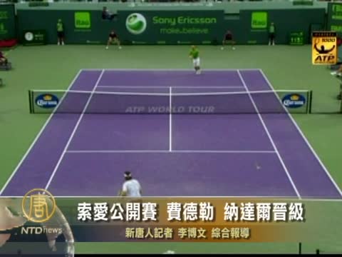 【新唐人2011年3月29日訊】星期一,在美國邁阿密舉行的索尼-愛立信網球公開賽繼續第三輪的爭奪,結果西班牙球王納達爾和瑞士球王費德勒各自擊敗對手,晉級16強。