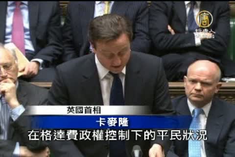 【新唐人亞太台2011年3月29日訊】英國首相卡麥隆星期一(28號)表示,在利比亞設立的禁航區非常有效,但平民的狀況仍非常令人擔憂。當天他也和法國總統薩科齊發出「最後通牒」,要格達費支持者棄暗投明,加入到爭取自由的民眾一邊。