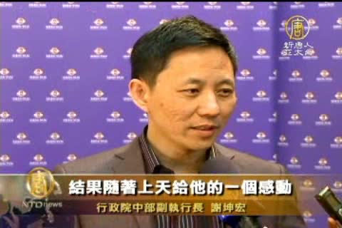 行政院中部副執行長 謝坤宏:「整個神韻給了我最大的感動,是所有劇情的融合,不僅是把我們中國幾千年的文化結合,再加上現代的舞蹈,再加上音樂跟背景,再加上整個...只能用那兩個字形容,就是「神韻」。」