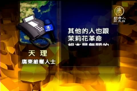 廣東維權人士 天理:「當局是利用茉莉花革命,抓那個敢說話的、維權的,他們(當局)認為是出頭的,(當局)是故意藉這個事件來抓人,這是一個陰謀;其實他抓的人只有幾個是公開支持茉莉花革命的,其他的人也跟茉莉花革命,根本是無關的。」