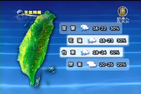 【新唐人亞太台2011年3月30日訊】來關心天氣。今天白天各地陽光露臉,北部溫暖,中、南部偏熱,氣象局表示,明天起到週六(4月2日),全台天氣穩定,但西部及離島地區易有霧,東部迎風面有短暫小雨機會,週日(4月3日)又會有一波冷氣團南下,到時候北部低溫將下探13度,北部、東部有降雨機會。以下帶您關心3月31號星期四,全台各地以及世界各主要城市的天氣預報。