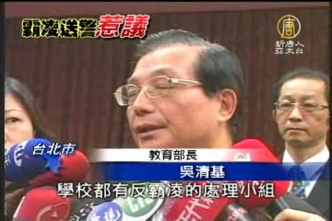【新唐人亞太台2011年3月31日訊】接下來看到今天的另一個新聞焦點。面對最近接二連三的霸凌案件,教育部長吳清基強調,將不再容忍學生違法行為,一旦校園霸凌涉及傷害、恐嚇、吸毒等違法情事,不再只是留校查看,也會依照「兒童少年福利法」移送法辦。
