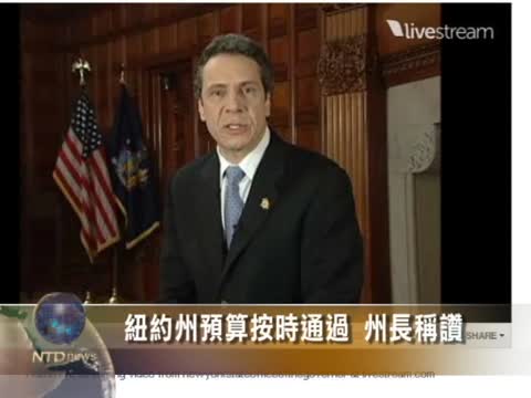 【新唐人2011年4月1日訊】紐約州2011-2012財政年度預算案最終在3月31日按時通過,州長庫默隨後發表講話,稱讚參眾兩院的表現。這個1325億美元預算案抵消了目前100億美元的財政赤字,同時沒有增加任何新的稅收,也沒有任何新的借貸。但是新預算案對教育和健康保險削減比較大。這項預算案在4月1日的最後期限之前通過,是1983年以來紐約州第四次財政預算按時通過。