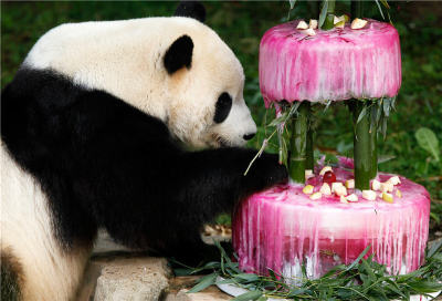 聖地亞哥動物園的熊貓姐妹珍珍(Zhen Zhen)和蘇琳(Su Lin)就是個例子。珍珍過2歲生日的前一天,蘇琳過4歲生日。珍珍當時看到碩大的水果冰淇淋竹子蛋糕,還比較斯文的從下往上吃。蘇琳就沒那麼溫柔了,一把抓下來4週歲的標識,整只熊就扑了上去。